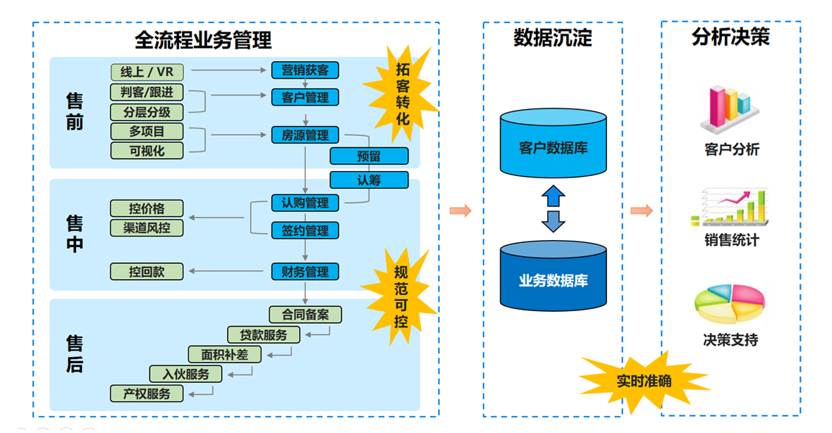 涵盖地产售前、售中和售后三大阶段,以房源、客户、合同为主线,贯彻实用、好用、易用的设计开发理念,为地产营销赋能!